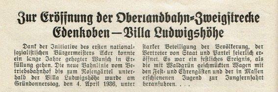 Am 4. April 1936 wurde die Oberlandbahn-Zweigstrecke "die Schneck" Edenkoben - Villa Ludwigshöhe eröffnet.